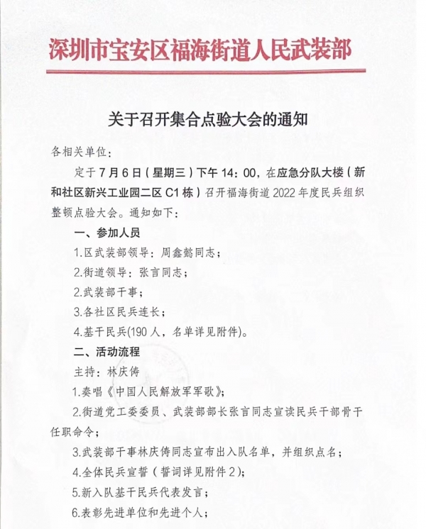 深圳市寶安區(qū)福海街道人民武裝部2022年度民兵組織整頓點驗大會于76日在應(yīng)急分隊大樓舉行。